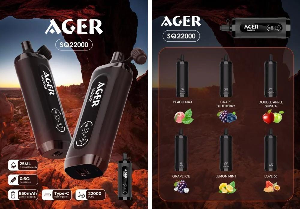 يجمع جهاز AGER SQ22000 بين الأداء القوي والتصميم العملي، مما يجعله خيارًا رائعًا للباحثين عن جهاز شيشة إلكترونية يمكن الاعتماد عليه ويوفر تجربة استخدام طويلة وممتعة.