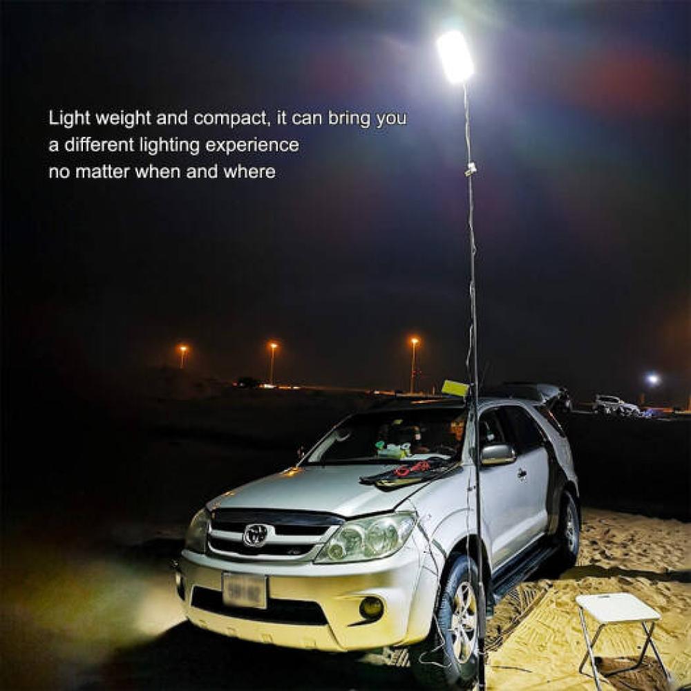 - تقنية فائقة السطوع: تستخدم لوحة إضاءة من نوع COB (Chip on Board) التي تحتوي على مئات من رقائق LED عالية الكثافة. هذا التصميم يوفر سطوعًا هائلاً قد يصل إلى 10,000 لومن، وهو ما يكفي لإنارة مساحة تعادل ملعب كرة سلة وتغطية عدة خيام.